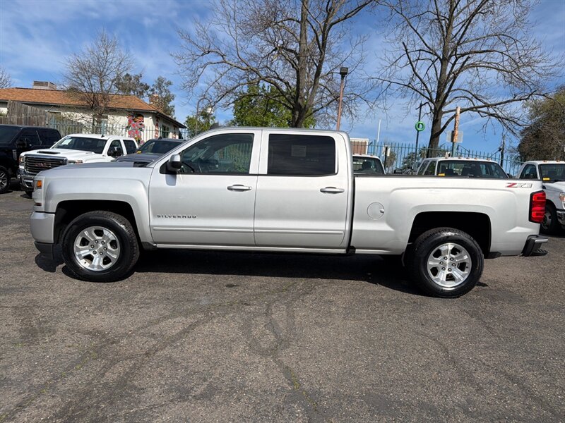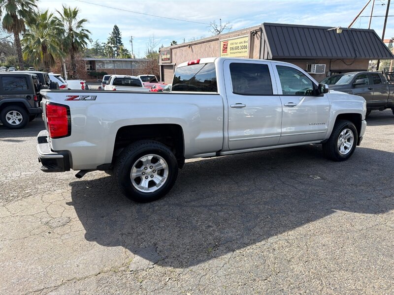 2018 Chevrolet Silverado 1500 Crew Cab LT Z71 4x4, long bed in Silver Ice Metallic with Dark Ash w/ Jet Black Accents interior. Powered by the EcoTec3 5.3L V8 (355 hp / 383 lb-ft), this truck is factory-equipped with the Z71 off-road package (off-road suspension, skid plates, locking rear differential, hill-descent control, all-terrain tires and front recovery/tow hooks), LT comfort and convenience features (power windows and locks, power-adjustable driver seat, cruise control, steering wheel audio controls), Chevrolet infotainment with Bluetooth and smartphone integration (Apple CarPlay/Android Auto), rearview camera, alloy wheels and fog lamps. The factory tow package includes an integrated hitch, trailer wiring and upgraded cooling capacity for towing. Below 72,000 miles (averaging under 8,000 miles/year), EPA-rated at 16 MPG city / 22 MPG highway, and in excellent overall condition.