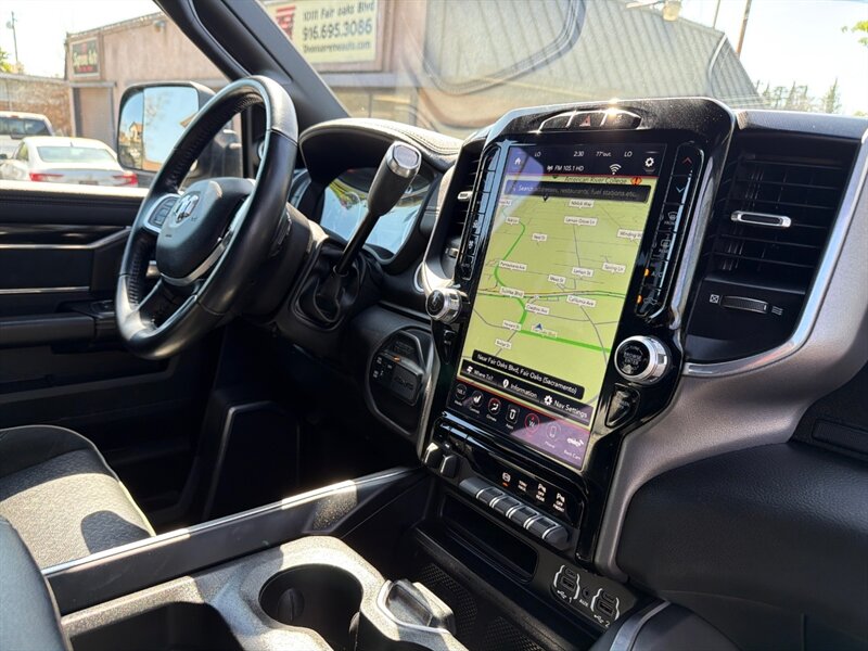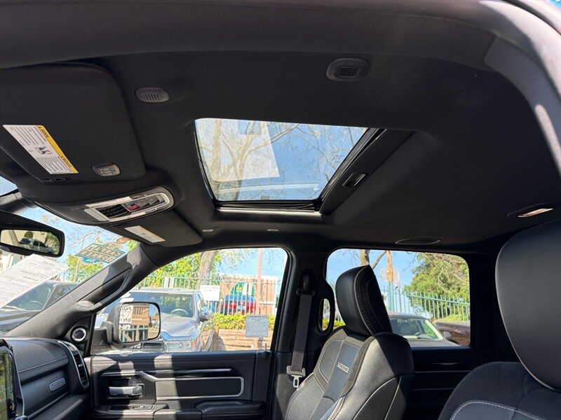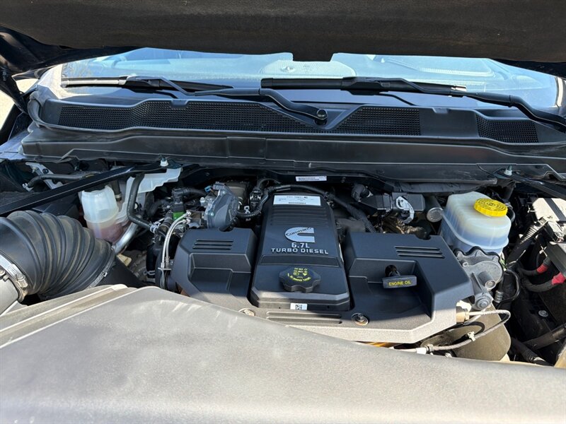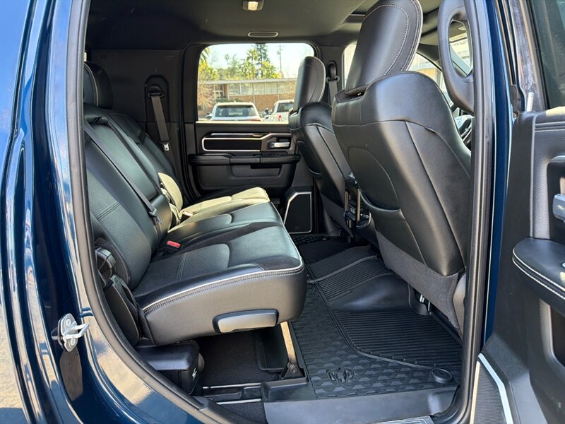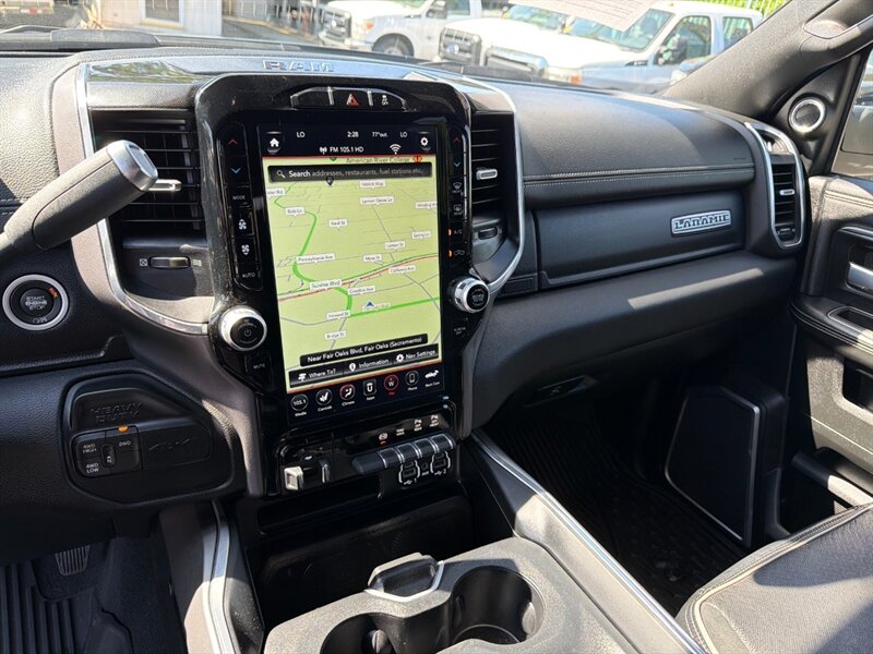 Factory equipment includes the Laramie’s premium leather-trimmed seating with power-adjustable, heated and ventilated front seats and a heated leather steering wheel; spacious Mega Cab rear seating with fold-flat rear seats and generous storage; dual-zone automatic climate control; full Uconnect infotainment with touchscreen, smartphone integration (Apple CarPlay/Android Auto) and Bluetooth; multifunction steering wheel and driver information display; keyless entry and remote start capability; heavy-duty 4x4 driveline and suspension with factory tow package (integrated trailer brake controller, tow wiring and hitch hardware, trailer sway control and tow/haul modes); power exterior mirrors with tow mirror function; LED exterior lighting and rearview camera with parking sensors; and full factory safety systems including multiple airbags, ABS and electronic stability control.